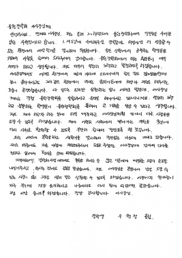 유원장회에 후원해주신 모든분들에게 감사의편지가